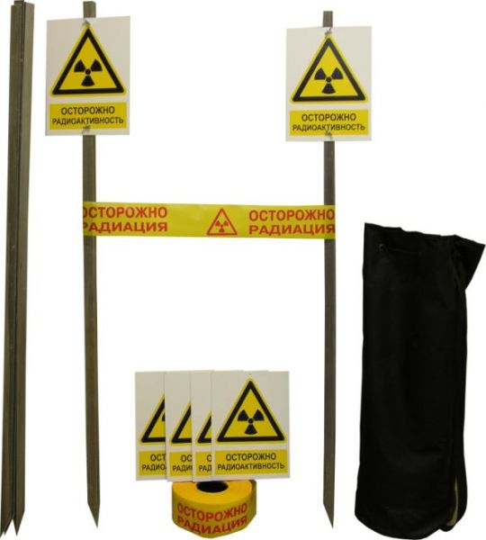 Набор "Радиационная опасность" (Стойка- 6шт, Знак «Радиационная опасность» на пластине-6 шт, Лента оградительная с надписью «Осторожно радиация»-1000 м, Сумка для переноски и хранения-1 шт, Болт крепежный-12шт, Гайка - барашек-12 шт.) ООО "ГАСЗНАК"