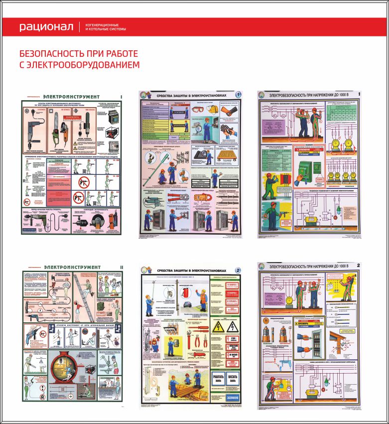 Стенд Безопасность при работе с электрооборудованием, 6 плакатов А3 (1100х1200; Пластик ПВХ 4 мм; Алюминиевый профиль)