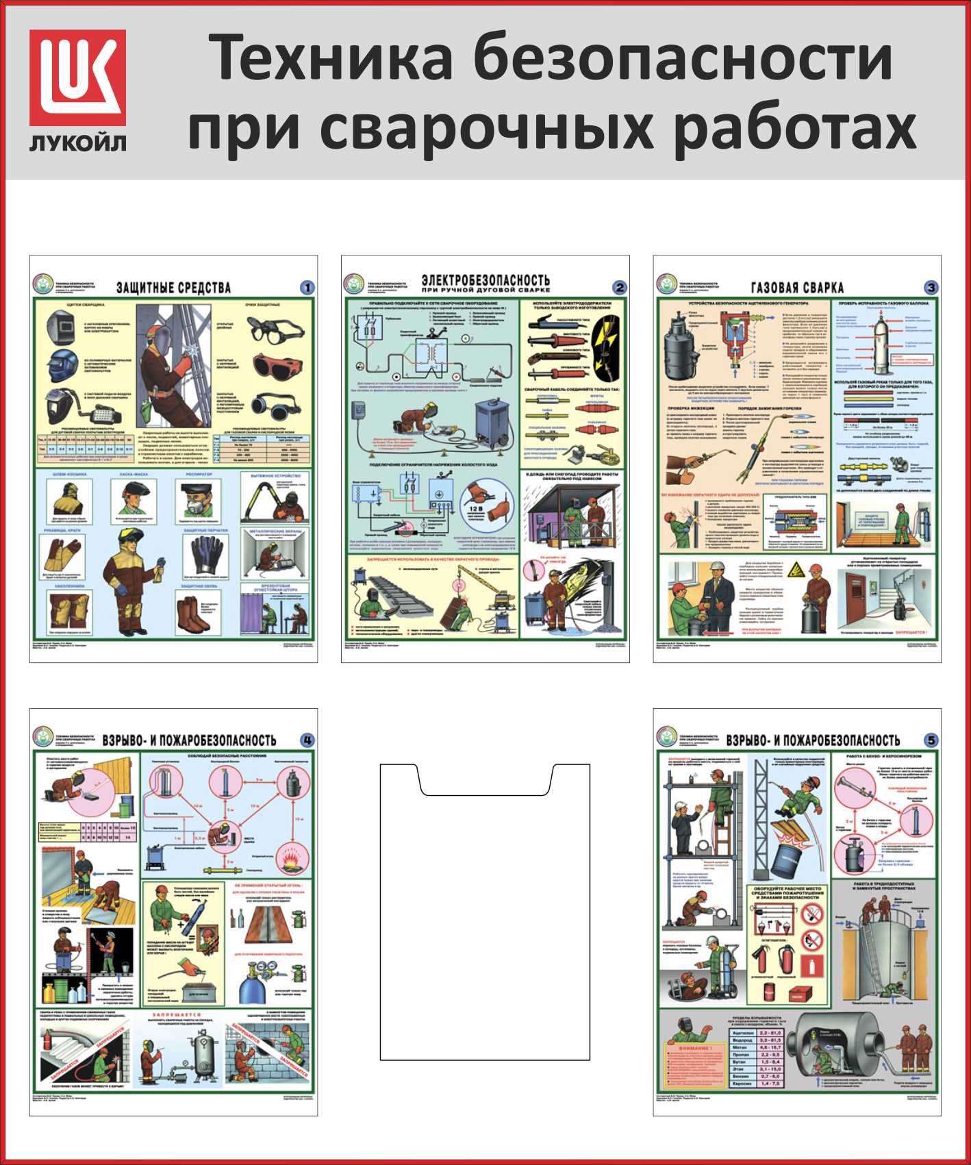 Стенд Техника безопасности при сварочных работах, 5 плакатов А3, 1 карман А4, Логотип (1000х1200; Пластик ПВХ 4 мм, пластиковый профиль; Пластиковый красный)