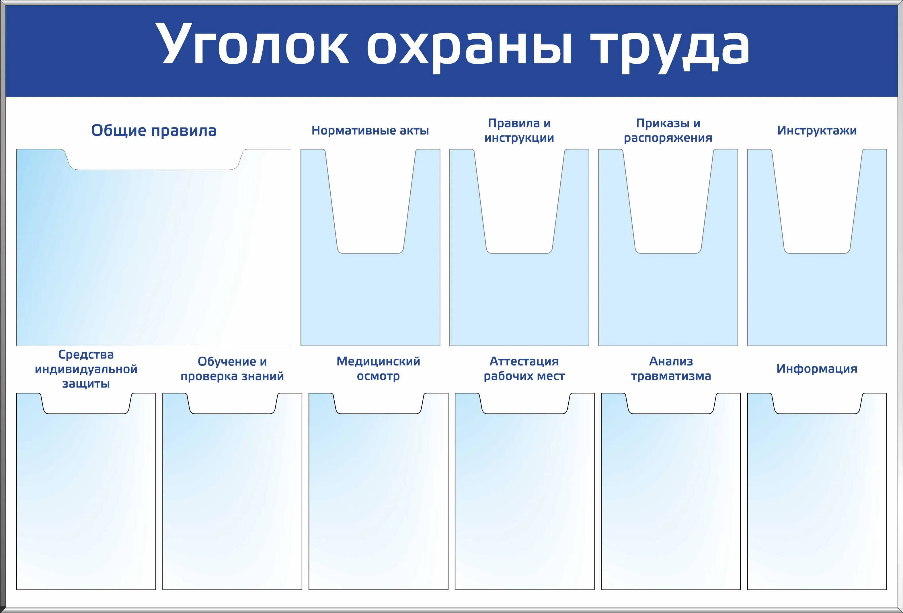 Стенд - Охрана труда. Карман плоский горизонтальный А4-2шт, карман плоский вертикальный А4-4шт, перекидное устройство А4 на 10 рамок (1200х1000; Пластик ПВХ 4 мм, алюминиевый профиль)