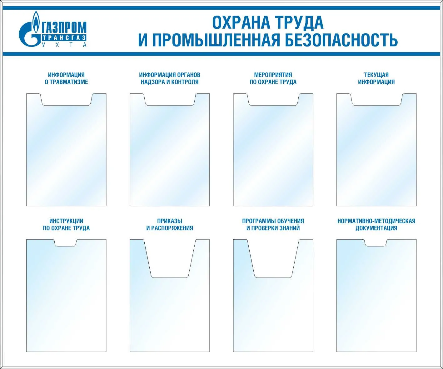 Стенд Уголок охраны труда 1200х1000 (пластик ПВХ 4 мм, 6 плоских карманов А4, 2 плоских горизонт. карманов А4), логотип Газпром трансгаз (Пластик ПВХ 4 мм , пленка самоклеющаяся, алюминиевый профиль) (; Пластик ПВХ 4 мм , пленка самоклеющаяся, алюминиевый