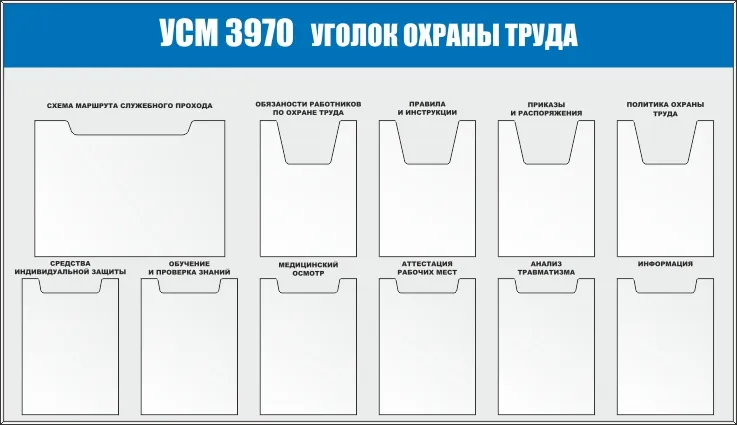 Стенд Уголок охраны труда, 6 карманов А4 (плоские), перкидное устройство на 7 рамок, перкидное устройство на 4 рамки, Логотип (1400х1200; Пластик ПВХ 4 мм; Пластиковый белый)