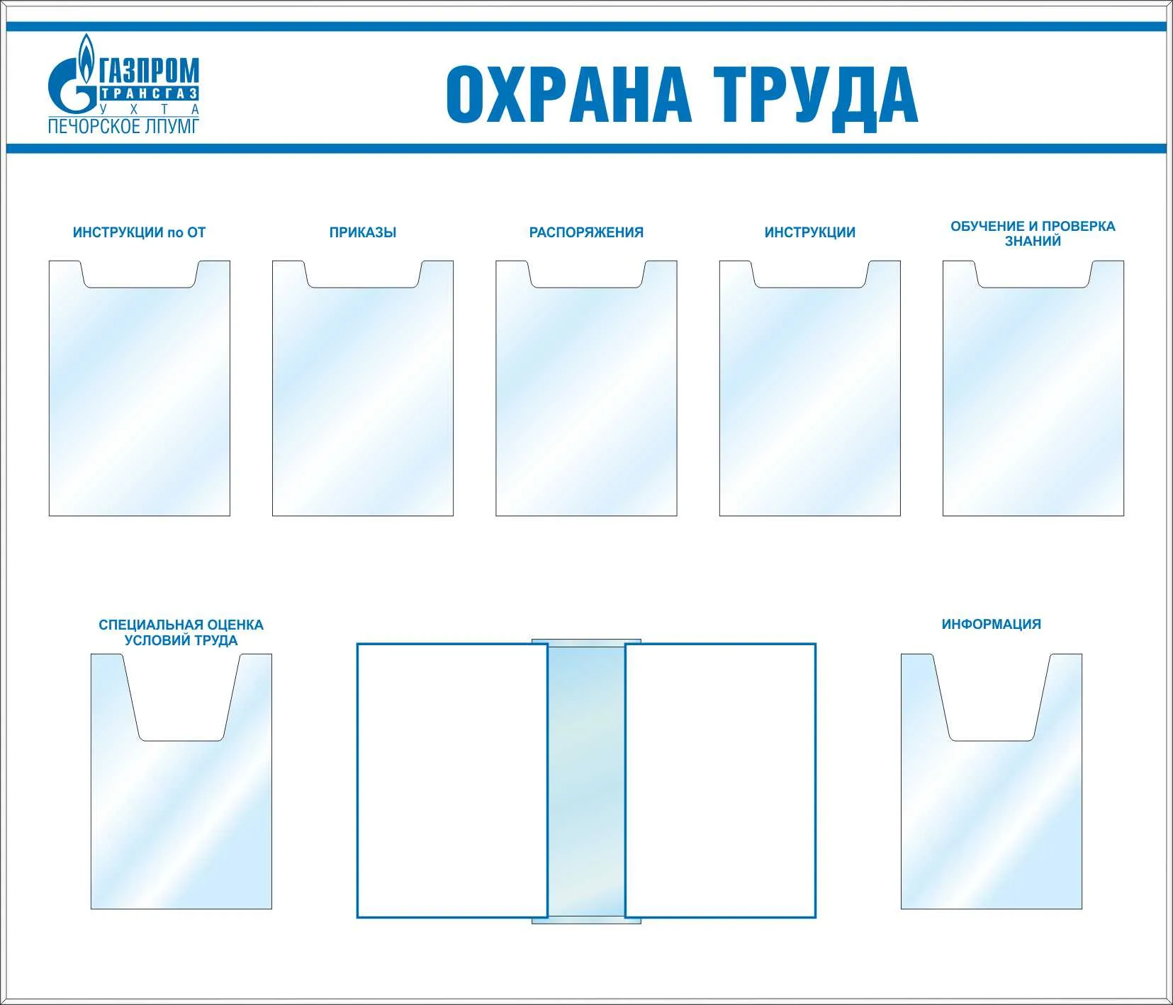Стенд Уголок охраны труда, карман А4 плоский-5шт, карман А4 объемный-2шт, перекидная система А4 на 10 рамок (1400х1200; Пластик ПВХ 4 мм, алюминиевый профиль; Алюминиевый профиль)