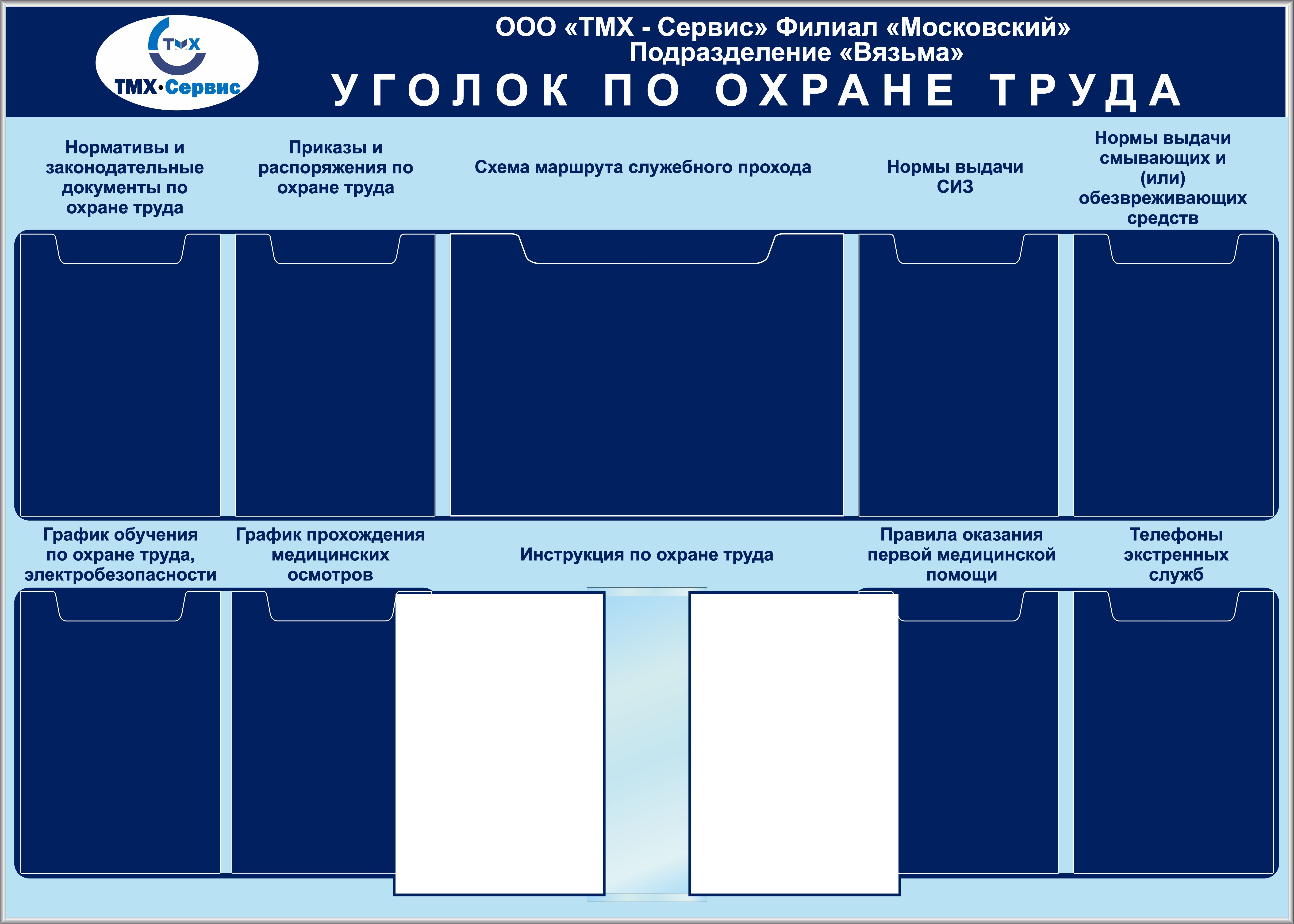 Индивидуальный Стенд. Уголок охраны труда, Логотип (600х900; Пластик ПВХ 4 мм; Алюминиевый профиль) (объемные карманы А4х2 шт., Демосистема Gasznak А4х 6 рамок Профиль-серебро, фон-фото, монтаж)