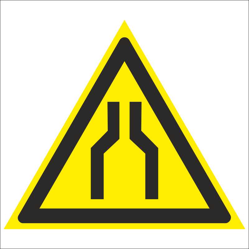 На территории заводов и иных предприятий возможно наличие участков, в пределах которых проход (проезд для транспортных средств) сужается или затруднен из-за выступающих вперед конструкций. Эти места необходимо проходить (проезжать) с особой осторожностью. Предупредить людей о возможной опасности позволяет знак «Осторожно. Сужение проезда (прохода)». Его размещают в складских помещениях и других зонах, где присутствуют подобные сужения или усложняющие проход конструкции.Продукция произведена на территории Российской Федерации и соответствует критериям подтверждения российского происхождения согласно Постановлению Правительства РФ № 719. Номера реестровых записей: 10651105, 10626803. Код ОКПД 2: 32.99.53.190 и 22.29.29.190.